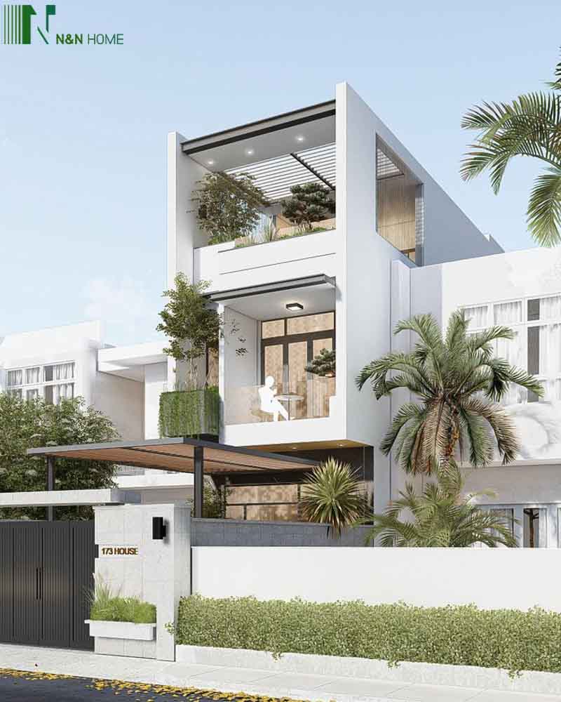 Mẫu nhà phố hiện đại này là một tuyệt tác của sự tối giản và thông minh. Với thiết kế mở, các không gian sống được kết nối hài hòa, tận dụng tối đa ánh sáng tự nhiên. Hệ thống cửa sổ lớn và ban công thoáng đãng không chỉ mang đến tầm nhìn bao quát mà còn tạo cảm giác rộng rãi, thoáng mát. Đặc biệt, cách bố trí nội thất khoa học giúp tối ưu hóa từng mét vuông, mang đến một không gian sống tiện nghi và hiện đại.