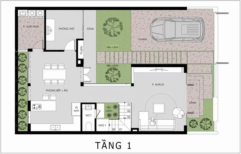 Tầng 1: Thiết kế gồm phòng khách, bếp kết hợp phòng ăn, nhà vệ sinh chung và gara ô tô (nếu cần). Thiết kế ưu tiên không gian mở, thuận tiện di chuyển và đón ánh sáng tự nhiên.