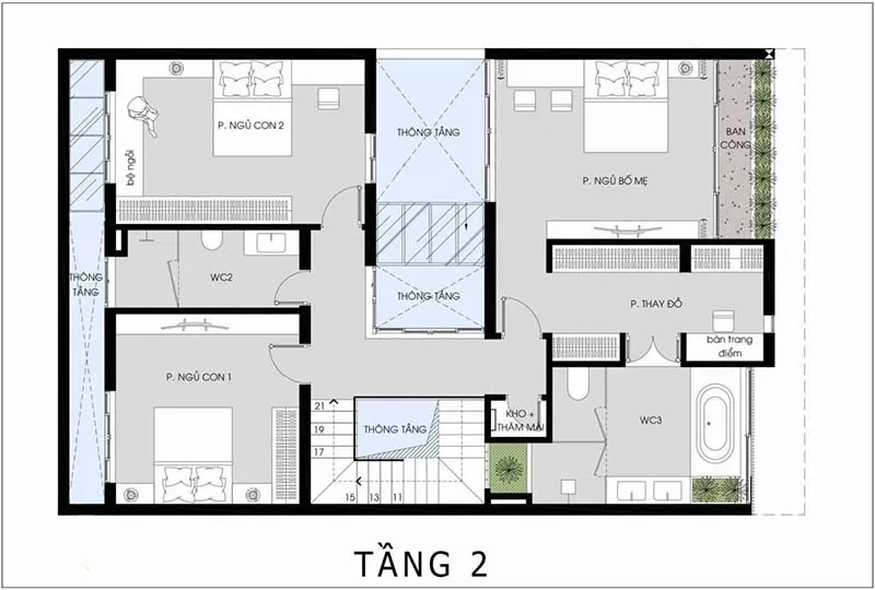 Tầng 2: Bao gồm các phòng ngủ chính, phòng ngủ phụ, phòng sinh hoạt chung và nhà vệ sinh. Tầng này tập trung phục vụ nhu cầu nghỉ ngơi, thư giãn của các thành viên trong gia đình.
