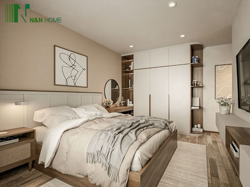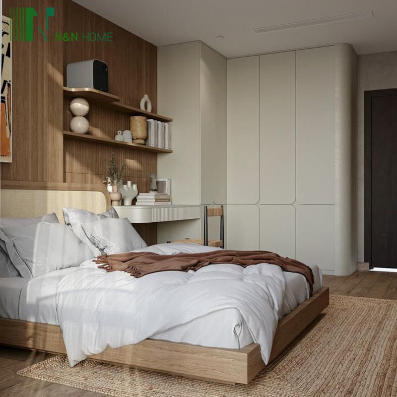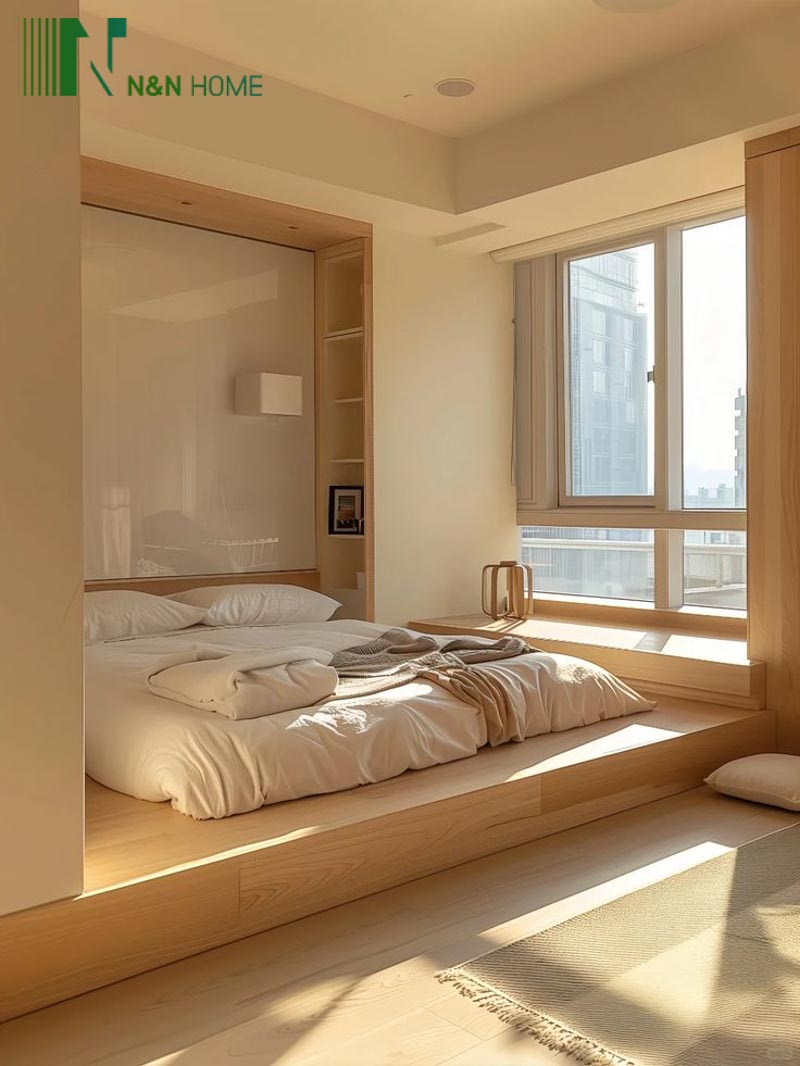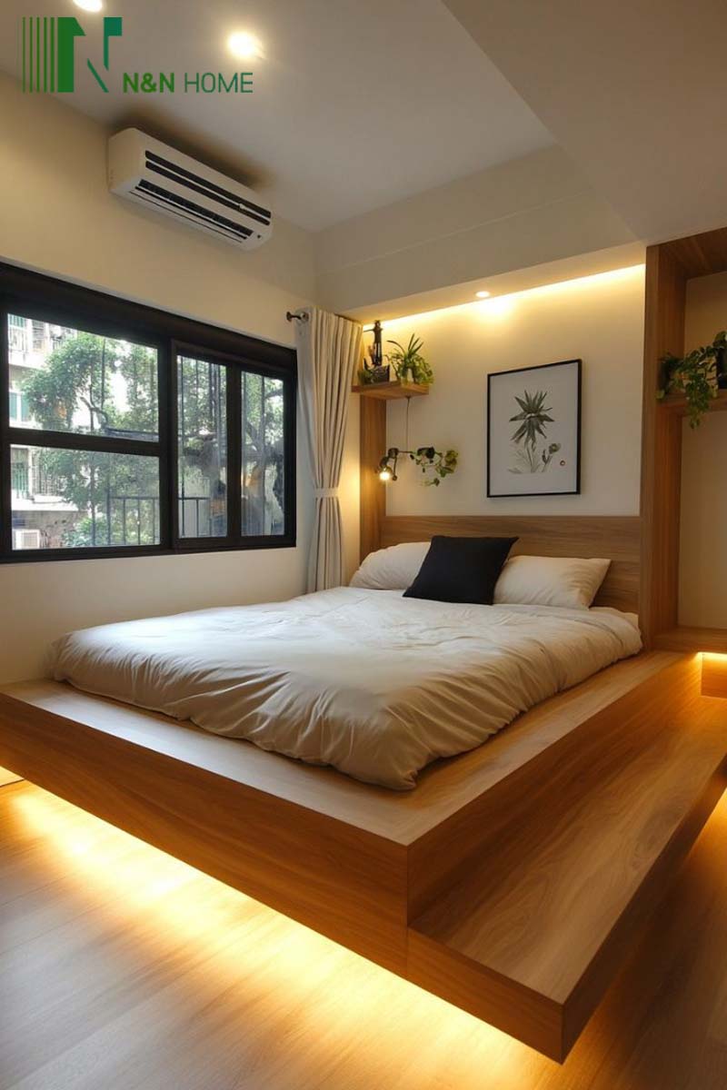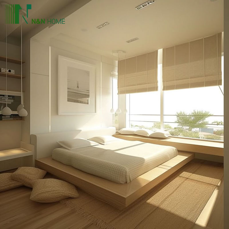 Giường nên đặt ở vị trí trung tâm hoặc sát tường, tạo lối đi thoáng và dễ di chuyển. Ưu tiên sử dụng giường có ngăn kéo hoặc chân cao để tăng không gian lưu trữ.
