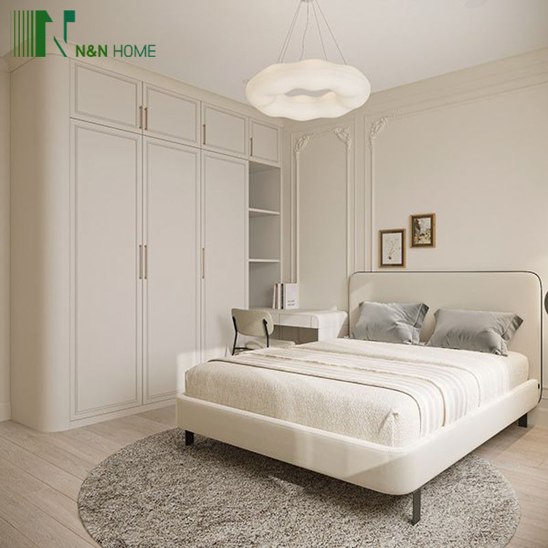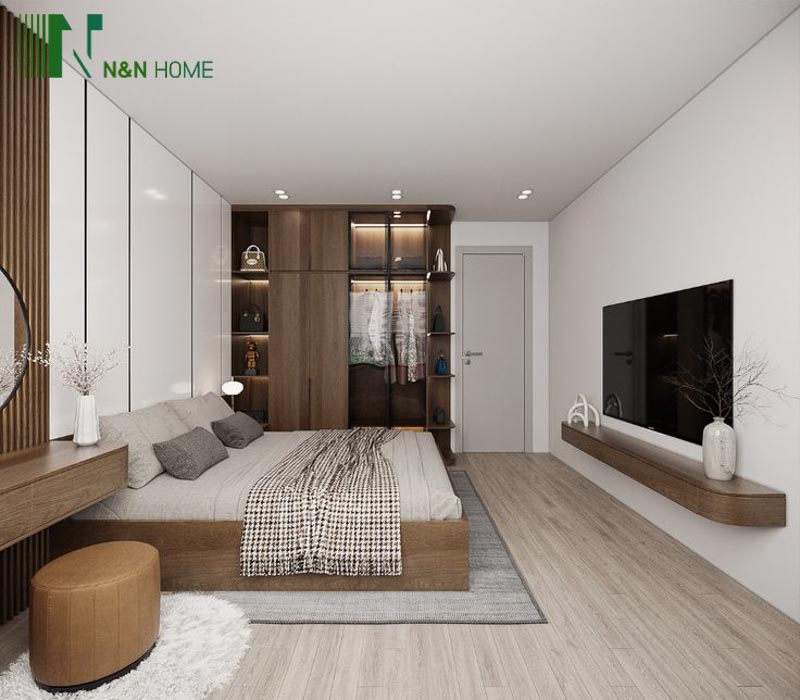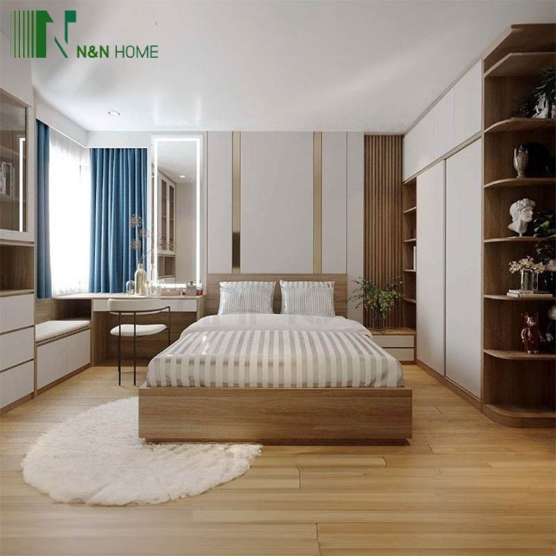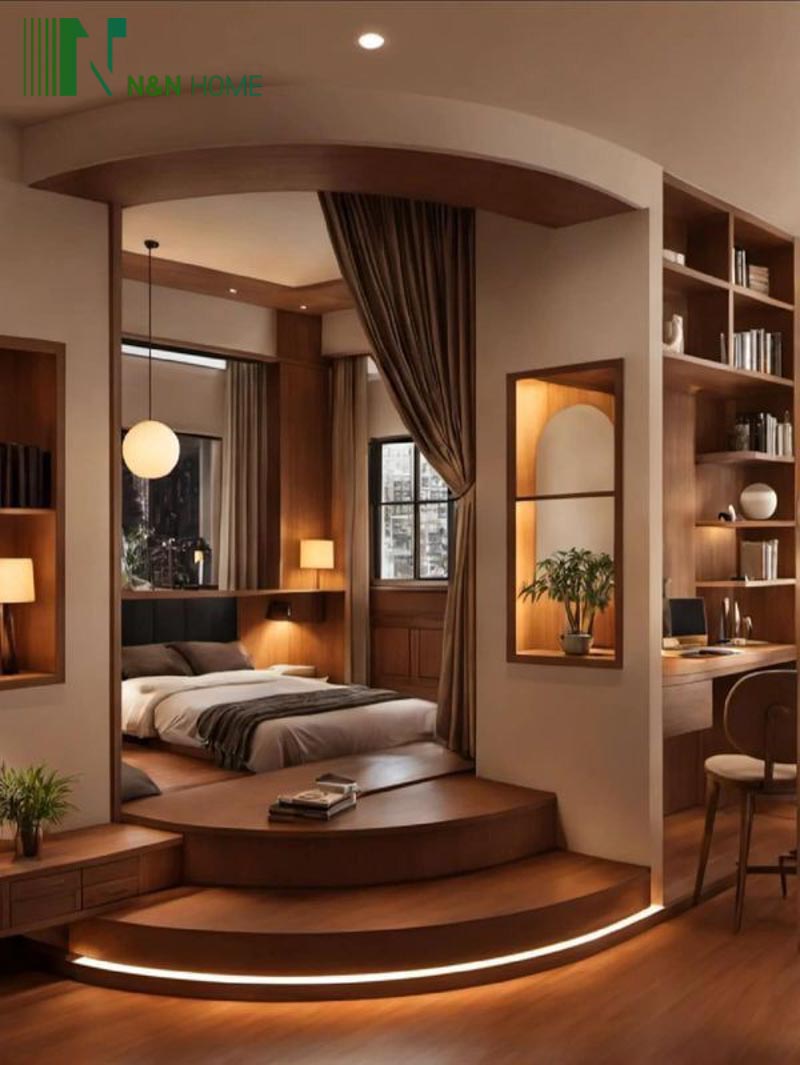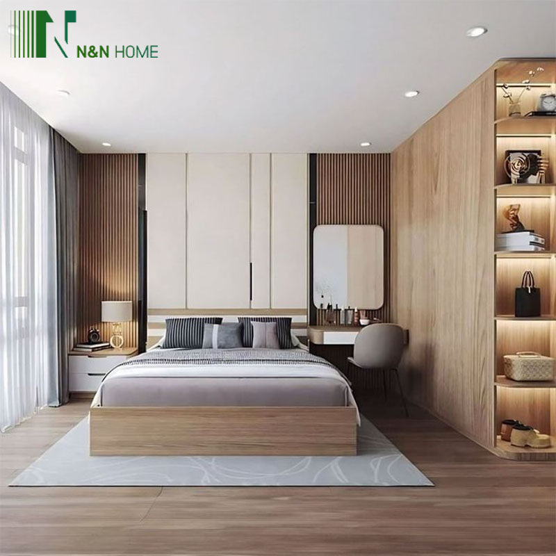 Giường nên đặt ở vị trí trung tâm hoặc sát tường, tạo lối đi thoáng và dễ di chuyển. Ưu tiên sử dụng giường có ngăn kéo hoặc chân cao để tăng không gian lưu trữ.