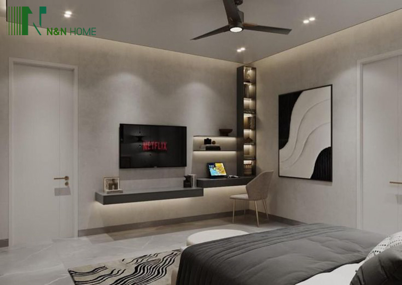 Tivi nên treo tường hoặc đặt trên kệ mỏng. Tránh bố trí quá nhiều đồ điện tử làm phòng trở nên rối và tốn không gian.