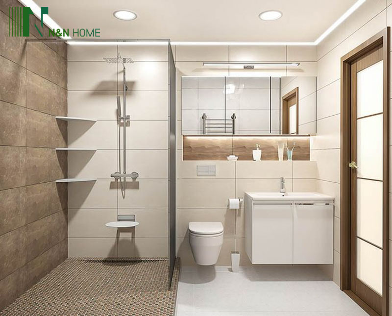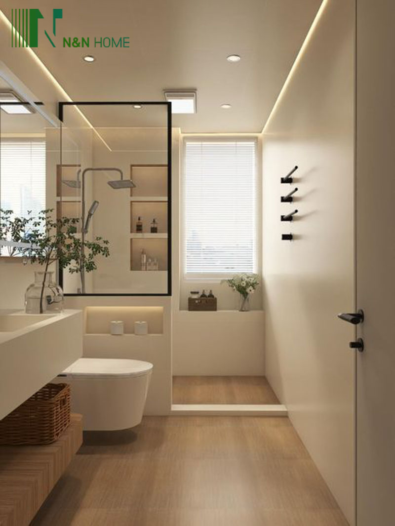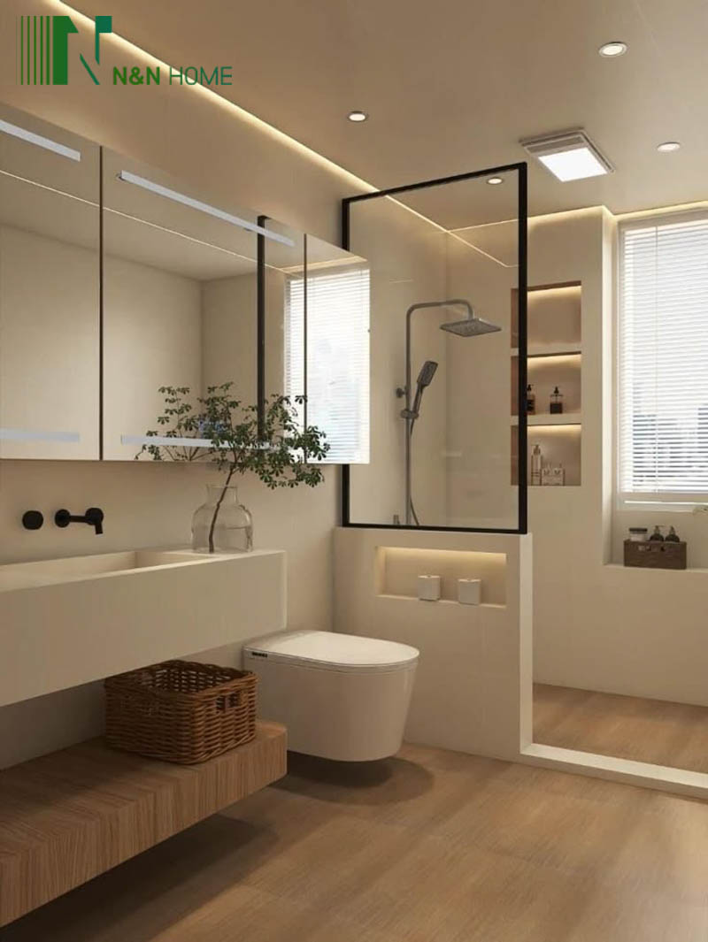 Khu vệ sinh nên có vách ngăn tắm kính hoặc rèm, đảm bảo sạch sẽ và tiện nghi. Trang bị đầy đủ lavabo, vòi sen, gương soi và hệ thống thông gió.