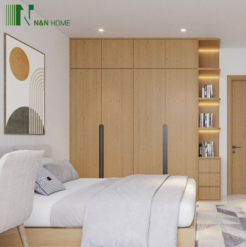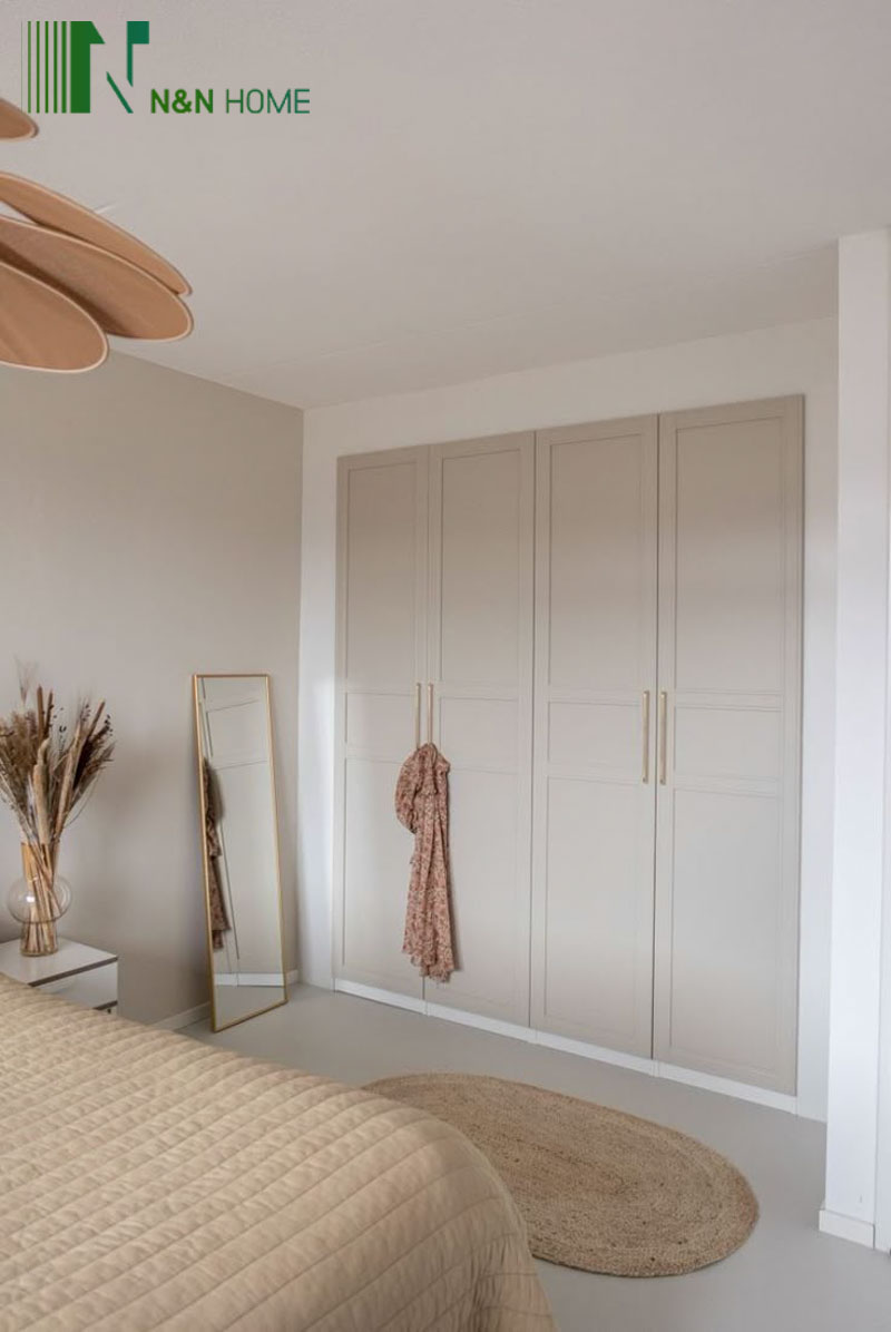 Sử dụng tủ âm tường hoặc tủ cửa lùa để tiết kiệm diện tích. Có thể lắp thêm các kệ treo tường để đựng đồ cá nhân, tăng tính gọn gàng cho căn phòng.