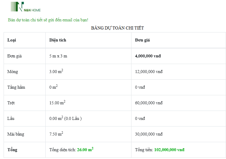 Bảng dự toán từ N&N Home cho thấy, với diện tích 26m² (gồm móng, trệt và mái bằng), chi phí xây dựng rơi vào khoảng 102 triệu đồng. Mức giá này dựa trên đơn giá 4 triệu/m², áp dụng cho mẫu nhà cấp 4 nhỏ gọn, không tầng lầu, phù hợp với thiết kế tối giản tại nông thôn. Đây là minh chứng thực tế cho thấy xây nhà cấp 4 với 100 triệu là khả thi nhưng diện tích và kết cấu rất giới hạn.