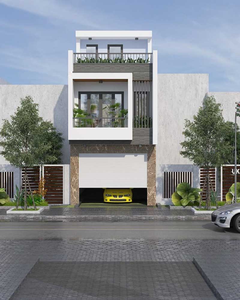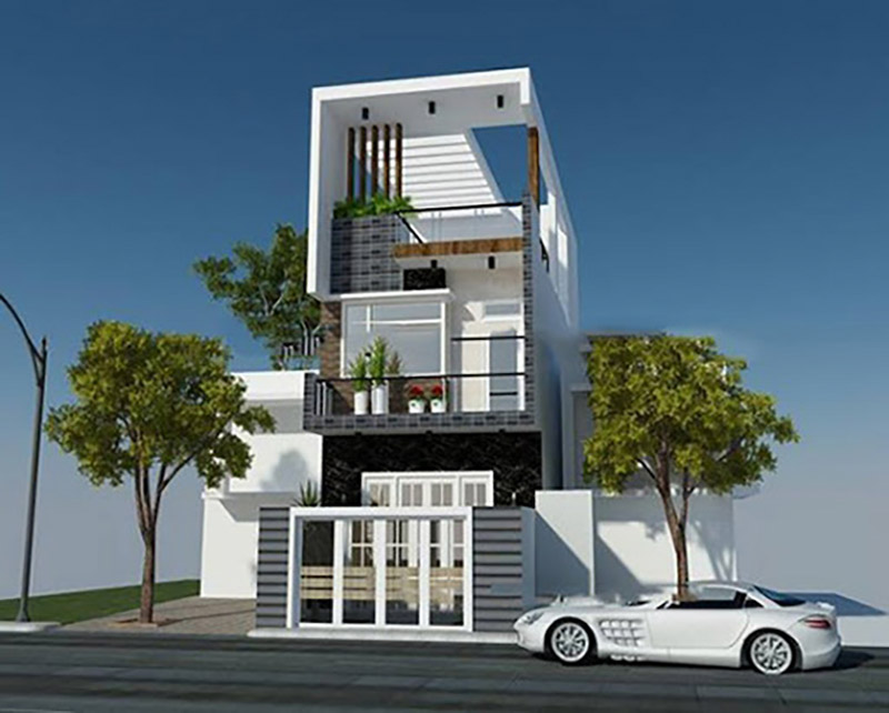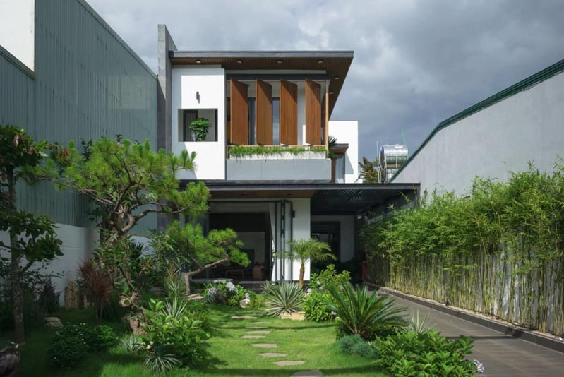 Mỗi tầng đều có các khu vực trồng cây xanh, giúp ngôi nhà hòa quyện với thiên nhiên. Giúp tạo nên không gian sống xanh, thoáng đãng. Mái bằng và các phần mái che trang trí mang lại vẻ đẹp thẩm mỹ và chống nắng hiệu quả.