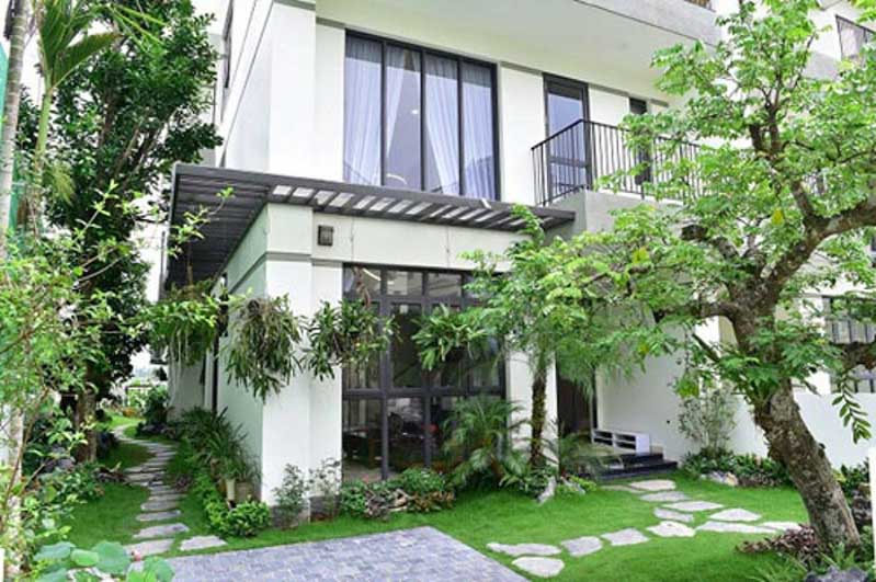 Khu vực sân vườn được bố trí cây xanh và các tiểu cảnh nhỏ, tạo ra một không gian gần gũi với thiên nhiên. Ban công trên tầng hai cũng được thiết kế để trồng cây, giúp mang lại không khí trong lành và mát mẻ.