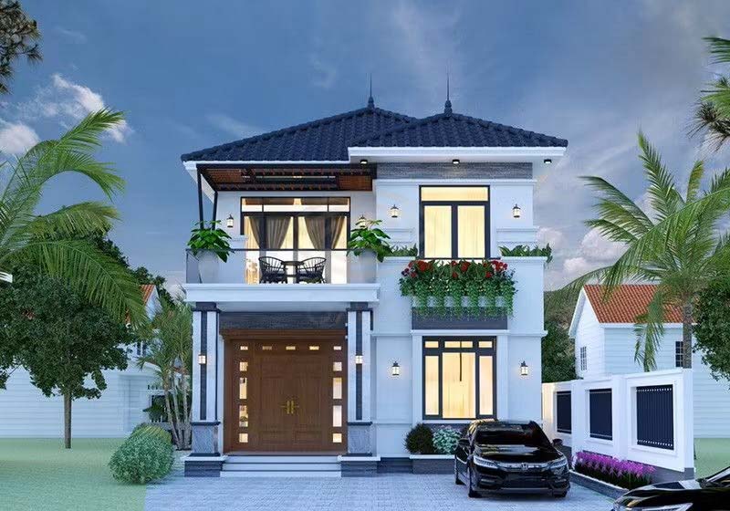 Mẫu nhà ống 2 tầng mặt tiền 7m này kết hợp giữa nét truyền thống và hiện đại. Mái ngói truyền thống màu xanh đen kết hợp với cột trụ vững chắc tạo cảm giác bề thế và kiên cố. Màu trắng chủ đạo của tường nhà kết hợp với khung cửa gỗ mang đến cảm giác ấm áp và sang trọng. Các chi tiết trang trí tinh tế giúp ngôi nhà thêm phần nổi bật và cuốn hút.