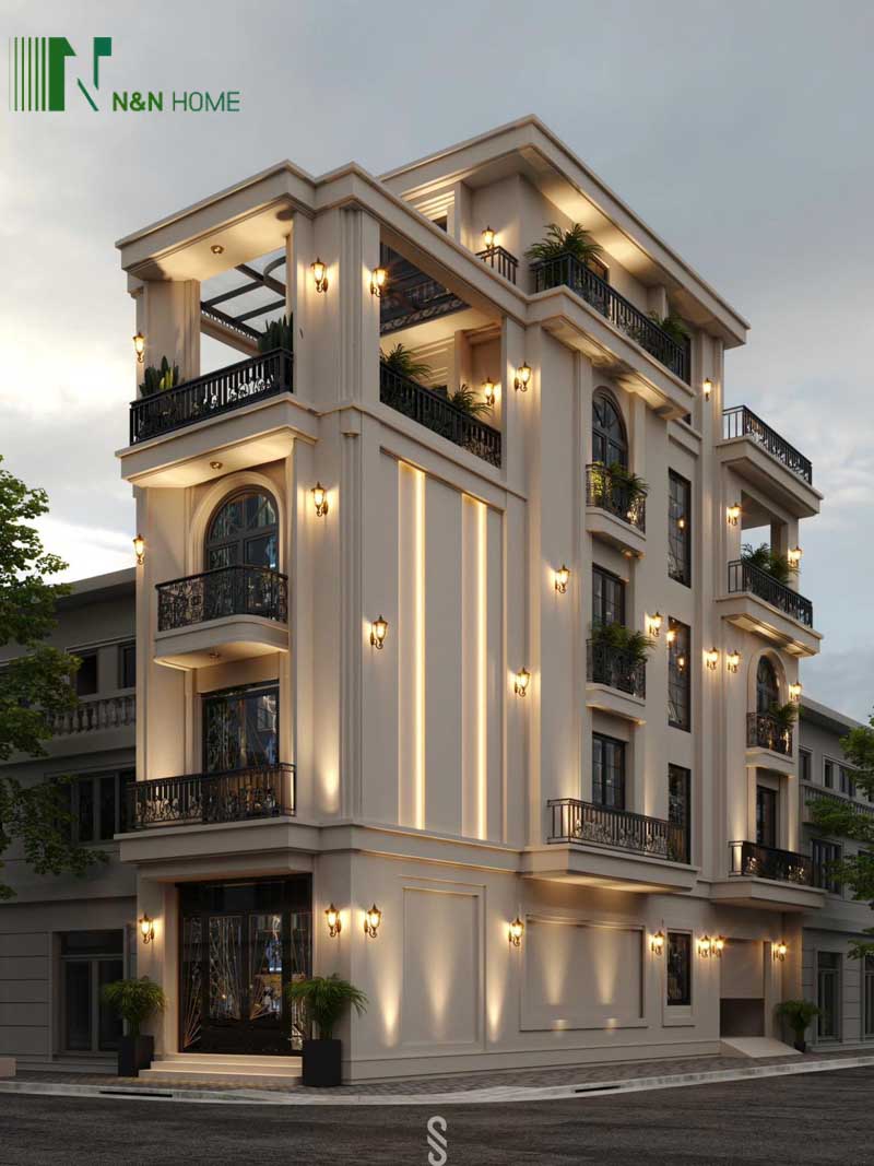 Với thiết kế tân cổ điển 5 tầng là sự giao thoa tinh tế giữa tân cổ điển của kiến trúc châu Âu và tính tiện nghi hiện đại. Thiết kế tân cổ điển nhấn mạnh vào sự cân đối và hình khối mạnh mẽ kết hợp với chi tiết nhẹ nhàng tạo nên được vẻ đẹp thanh lịch và trường tồn với thời gian. Thiết kế tân cổ điển 5 tầng với chỉ phào tinh tế tỉ mỉ tạo nên một căn nhà nguy nga tráng lệ đầy thu hút.