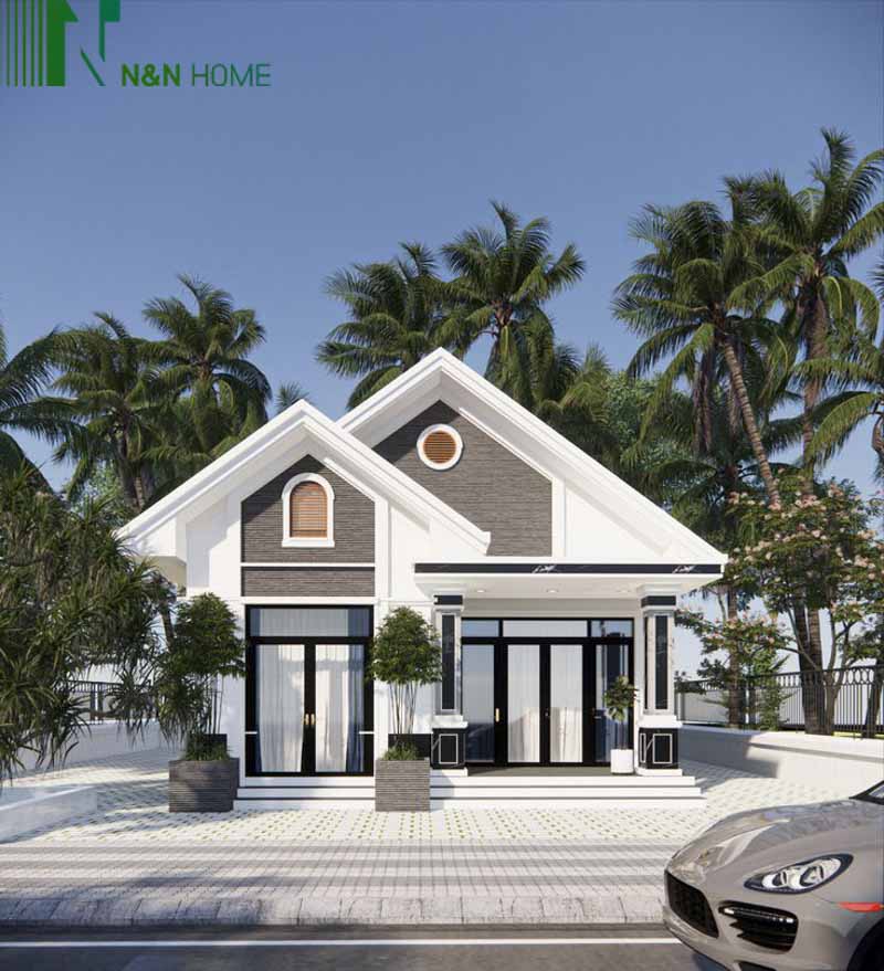 Thiết kế mẫu nhà cấp 4 này tạo ra sự hài hòa về màu sắc và vật liệu bởi việc sử dụng mái thái đẹp mắt. Cửa nhà được chế tạo từ kính cường lực với khung gỗ, giữ nét đẹp cổ điển nhưng vẫn hiện đại. Hệ thống cột trụ vuông chắc chắn và tinh tế, tạo sự hấp dẫn.