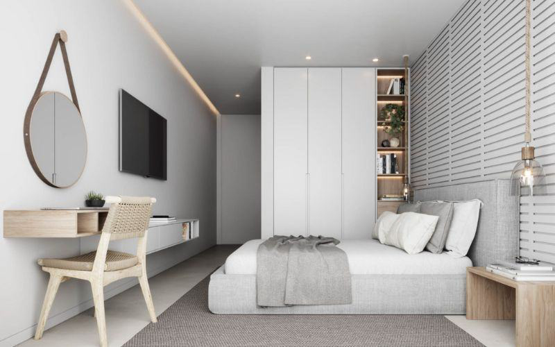 Phòng ngủ nên dùng tông màu nhẹ và nội thất đơn giản để tạo cảm giác thư giãn. Bố trí tủ âm tường hoặc kệ gọn giúp tối ưu diện tích. Ánh sáng dịu và rèm cửa phù hợp sẽ mang lại không gian nghỉ ngơi thoải mái.