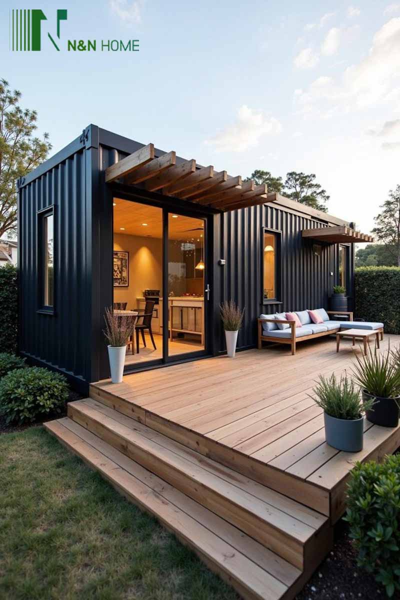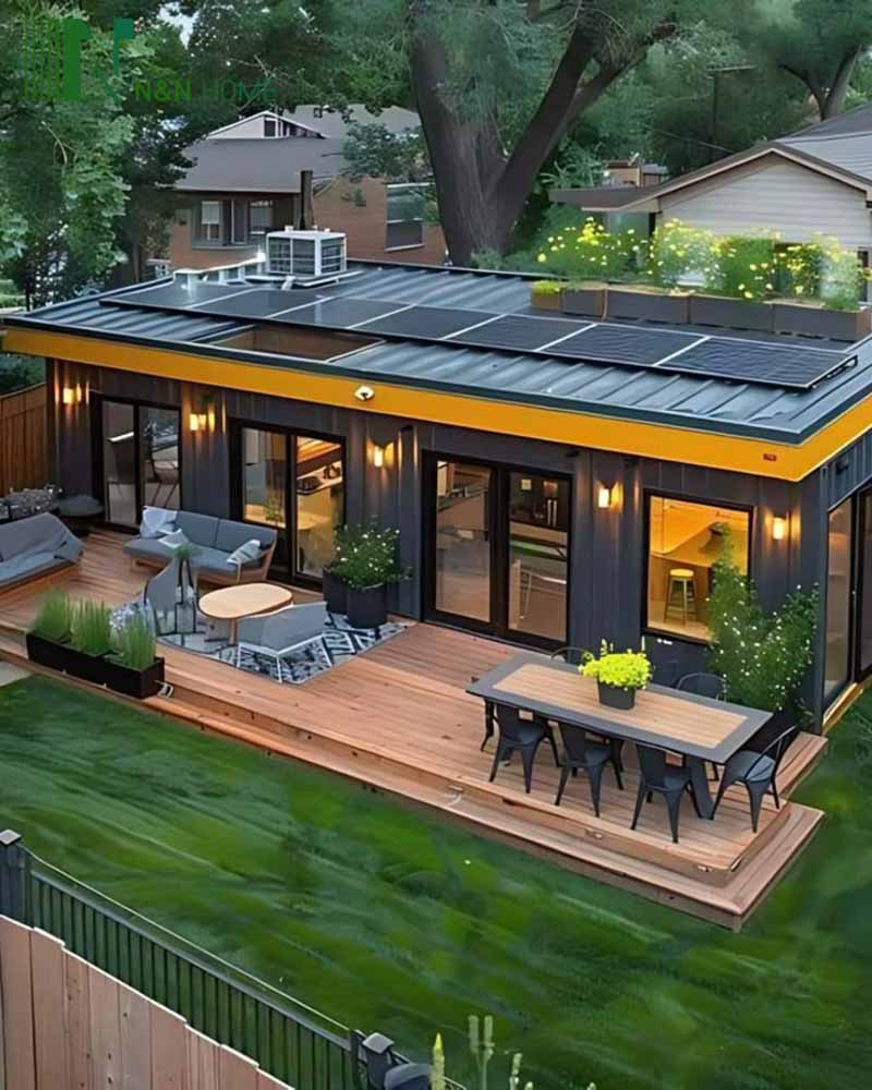 Với thiết kế homestay container có sân vườn sẽ mở rộng thêm không gian giúp thu hút khách du lịch. Quý khách có thể tận dụng không gian sân vườn để trang trí thêm cây xanh hoặc có thể tích hợp trang trí thêm bàn ghế ngoài sân vườn giúp tận dụng không gian để khách du lịch có thêm không gian thư giãn.