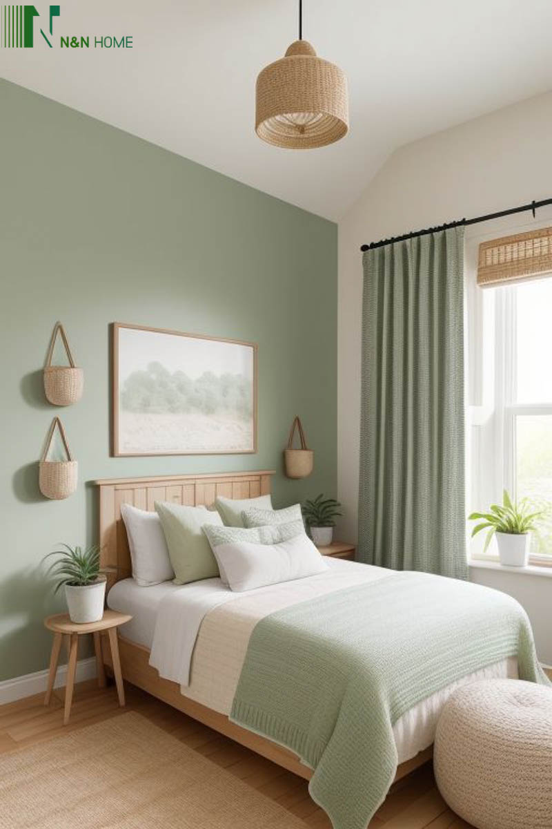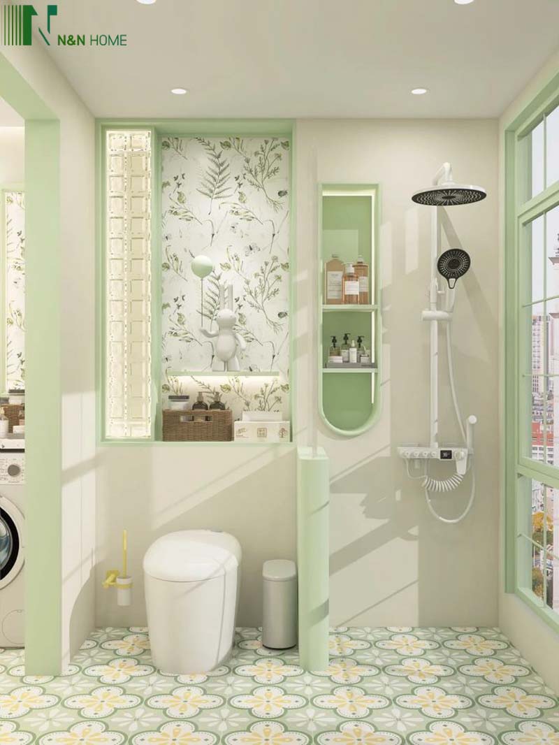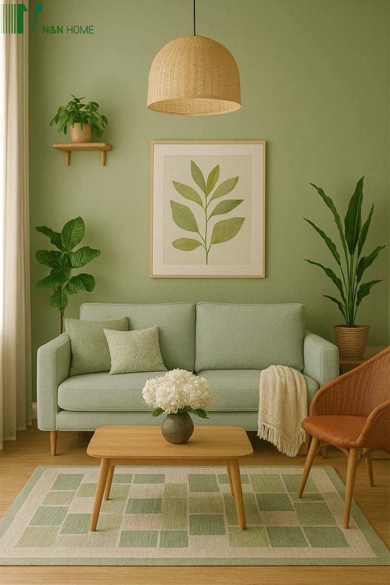 Tông màu xanh lá làm chủ đạo mang đến cảm giác tươi mới, gần gũi thiên nhiên và tràn đầy năng lượng. Màu xanh lá giúp không gian nhỏ trở nên sống động, kết nối với bên ngoài và tạo bầu không khí thư thái, dễ chịu.