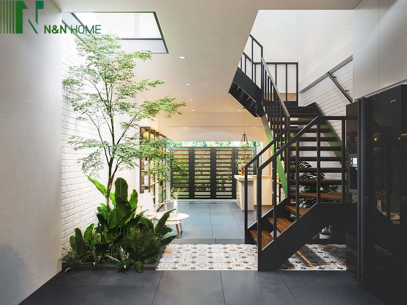 Thiết kế 4 tầng có gác lửng kết hợp giếng trời giúp không gian thoáng sáng tự nhiên. Giếng trời hỗ trợ lưu thông không khí, khắc phục tình trạng bí bách ở nhà ống. Khi kết hợp cửa kính cường lực, giếng trời vẫn đón nắng và che mưa hiệu quả. Không gian phòng khách và bếp nhờ đó cao thoáng, mang lại cảm giác rộng rãi và tiện nghi.