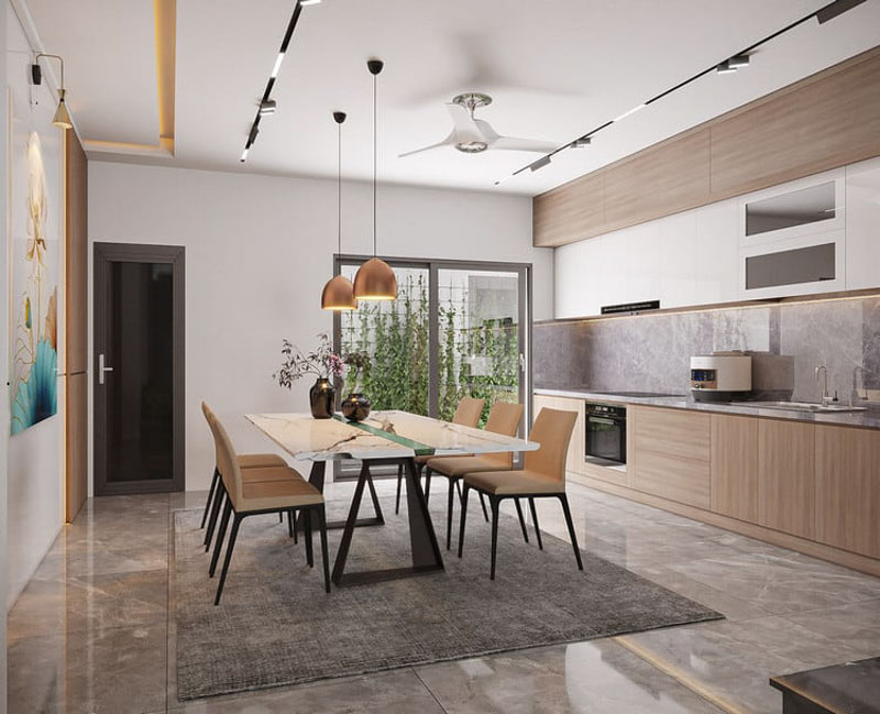 Khu vực bếp trong thiết kế nhà 4x8m 1 tầng thường tích hợp cùng phòng ăn để tối ưu diện tích. Bếp đặt gần giếng trời hoặc cửa sổ sẽ giúp không gian luôn sáng sủa và thông thoáng. Nội thất thông minh, bàn ăn gọn nhẹ là giải pháp hoàn hảo cho gia đình nhỏ. Việc sắp xếp khoa học còn tạo sự thuận tiện trong nấu nướng và sinh hoạt hằng ngày.