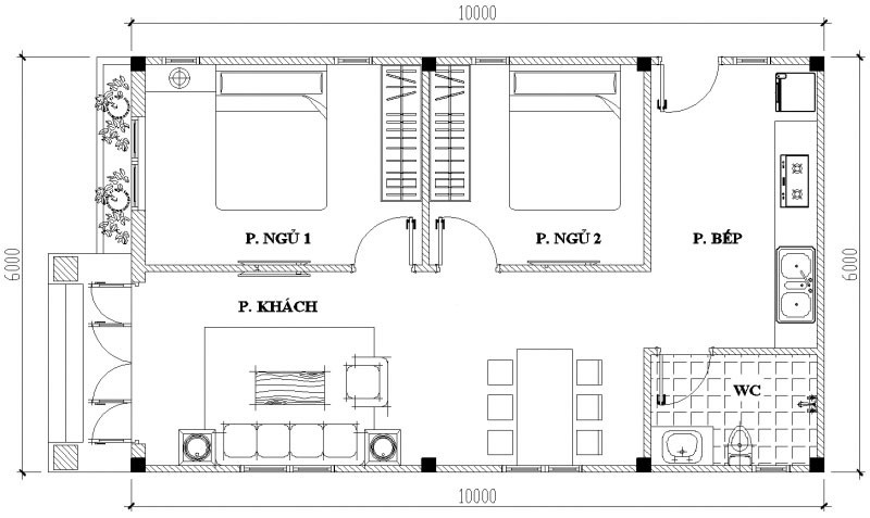 Bản vẽ mặt bằng công năng 4x8m 1 tầng 2 phòng ngủ